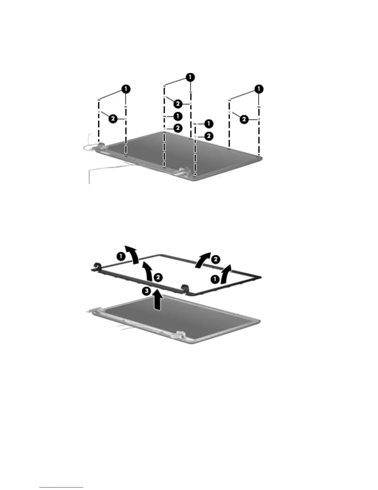 10. Remove the display bezel (3). The display bezel is available using spare part number