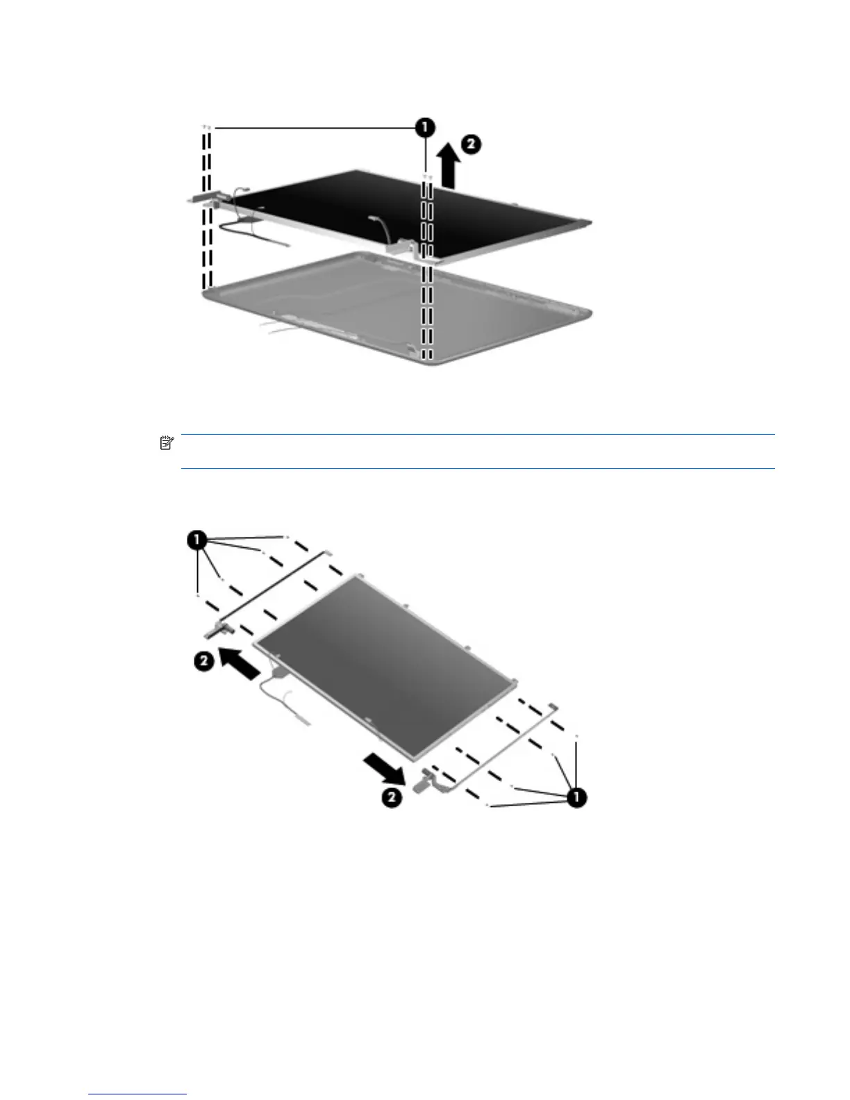 18. Remove the display hinges (2). The left and right display hinges are available using spare part