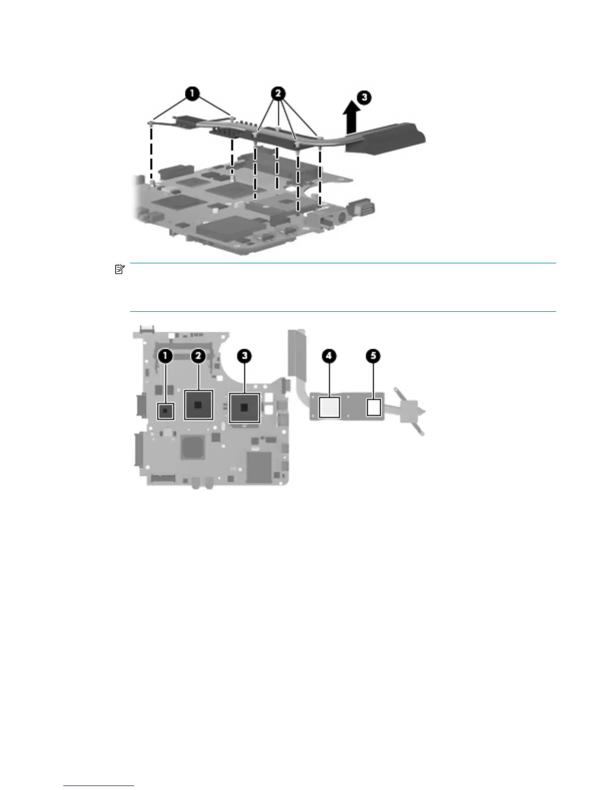 board (1), (2), and (3), and the heat sink components (4) and (5) each time the heat sink is removed.