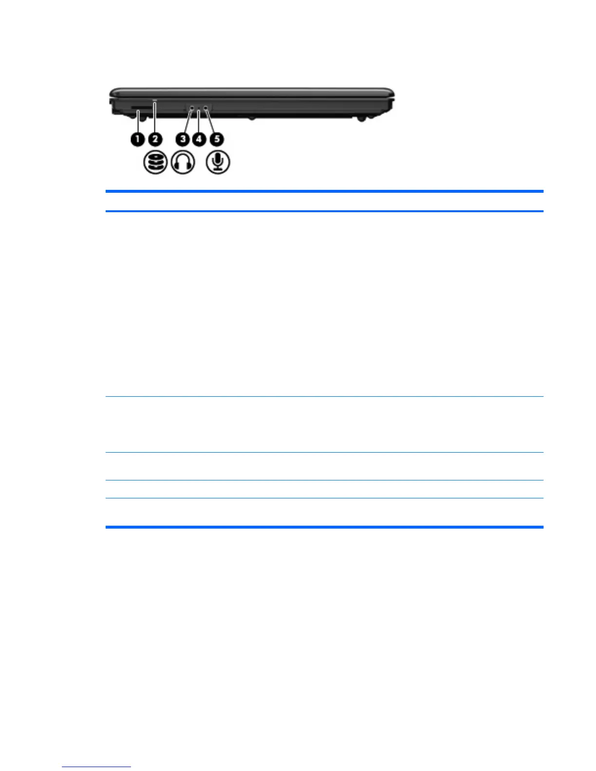 (5) Audio-in (microphone) jack Connects an optional computer headset microphone, stereo array