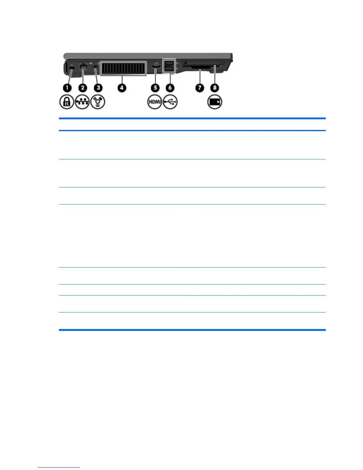 (1) Security cable slot Attaches an optional security cable to the computer.