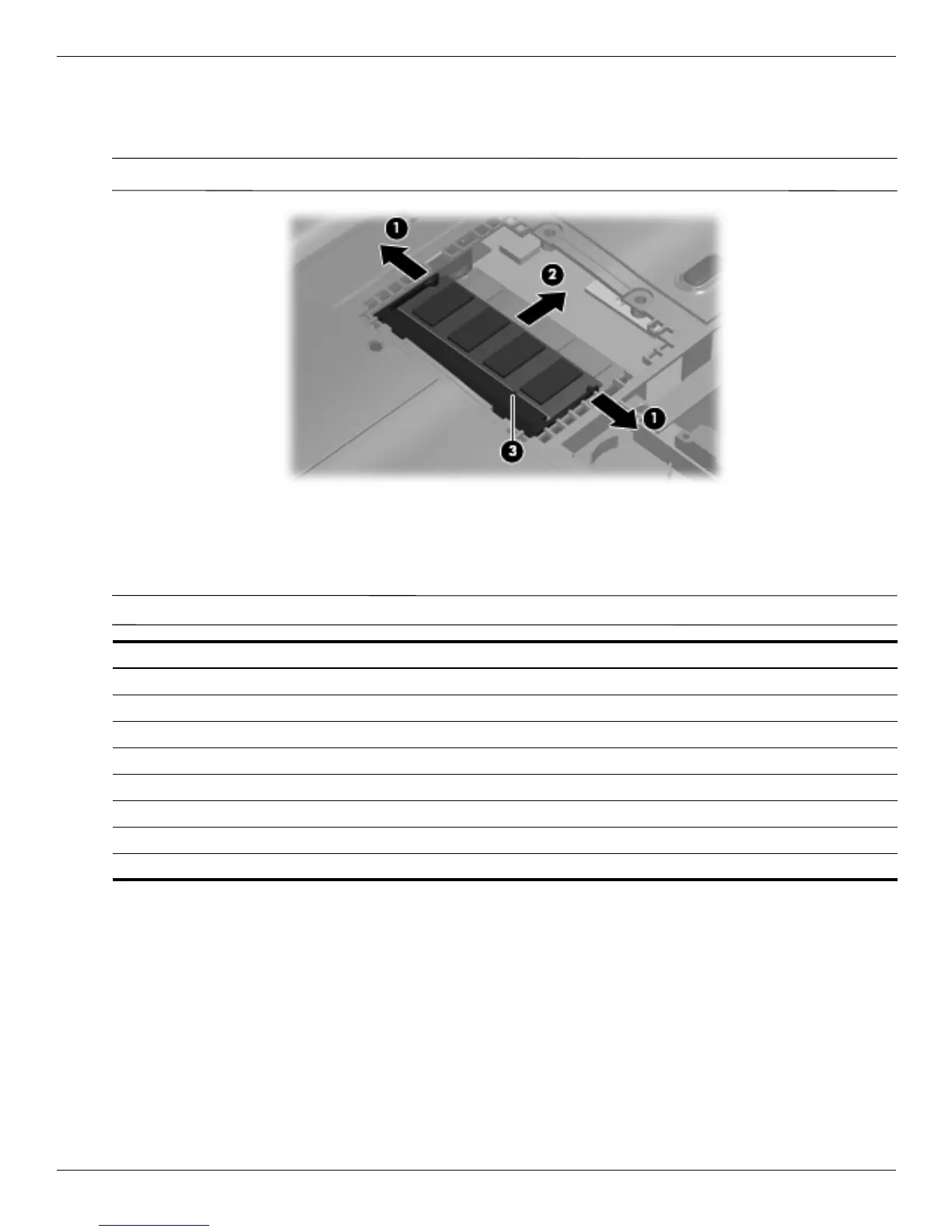 4. Remove the memory module 2 by pulling the module away from the slot at an angle.