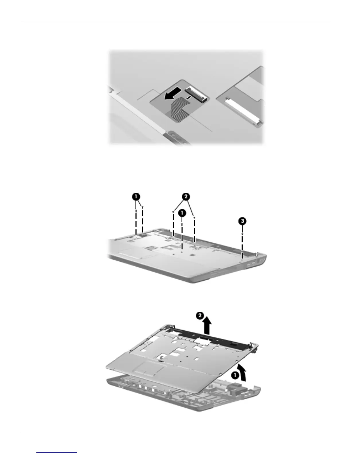 7. Lift the rear edge of the top cover 1 until the top cover disengages from the base enclosure.
