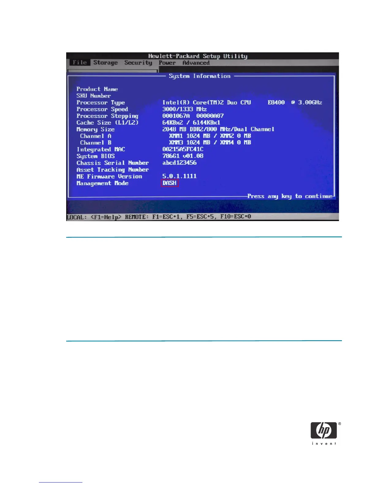 Figure 5 Management Mode (DASH highlighted) in the HP Compaq dc7900 Business PC