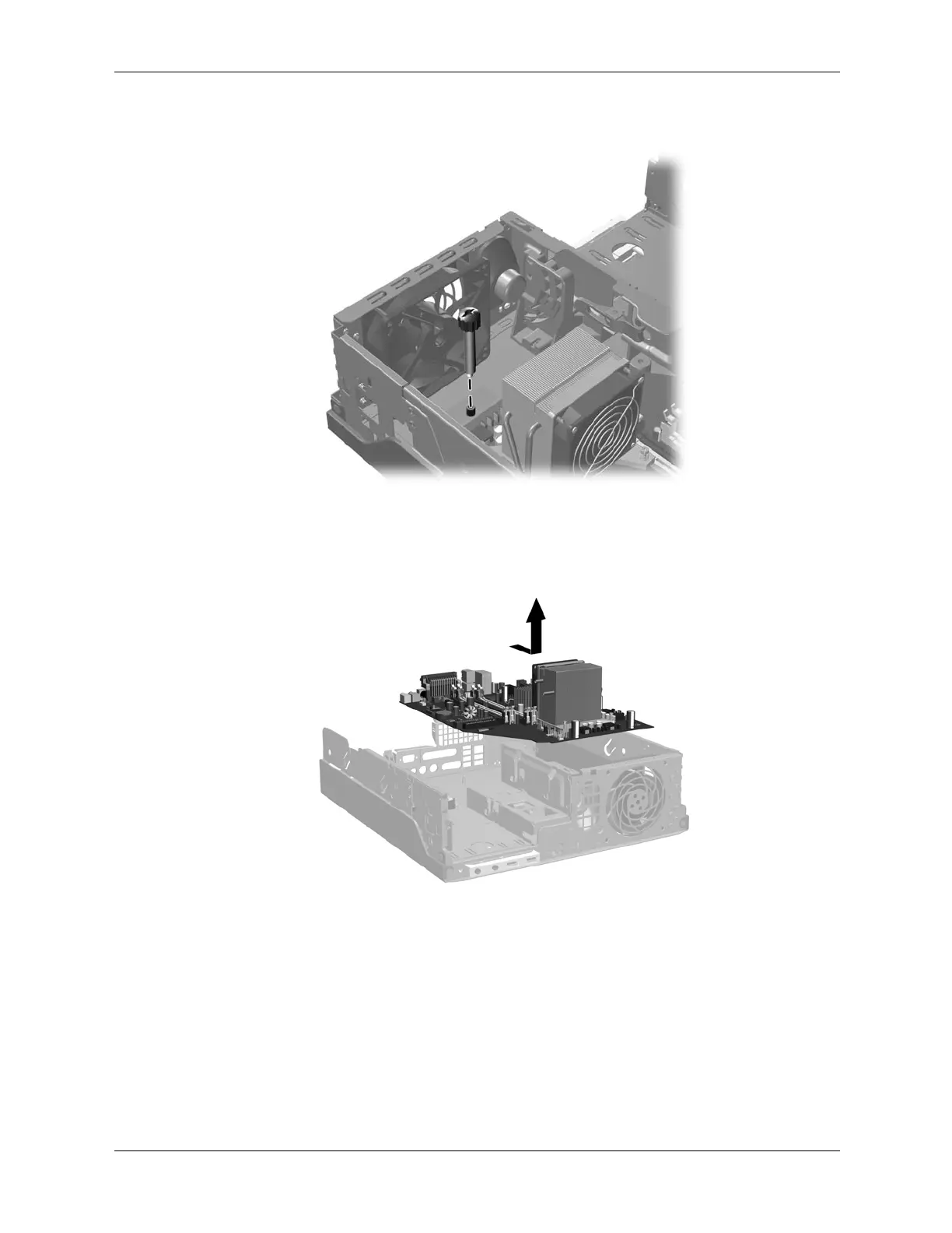 12. Remove the long mounting screw that secures the system board tray to the chassis.