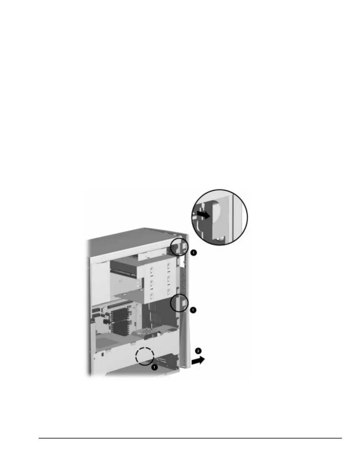 2. From the inside of the chassis, push in the release latches 1 and push the side of the bezel out