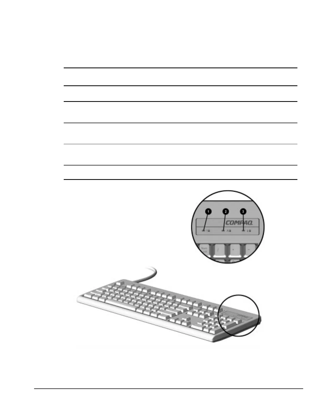 The following table lists the various keyboard light combinations, as well as the meaning and action
