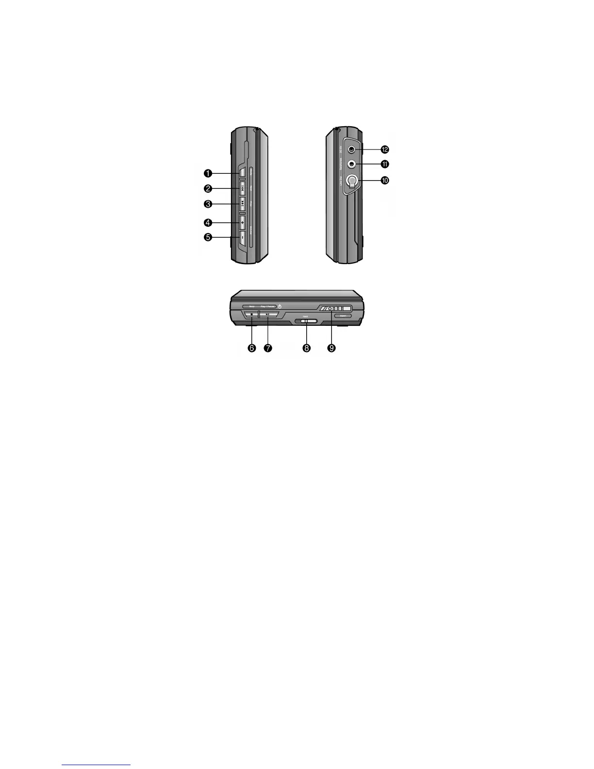 Your PM-1 player has the following features on its left side, front, and right side.
