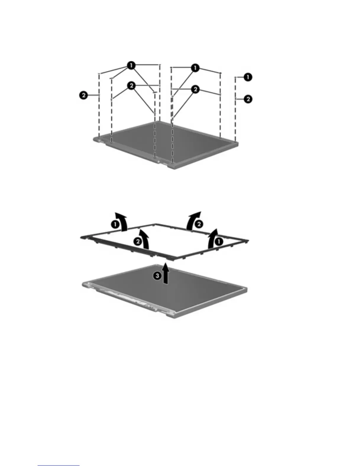 1. Remove all screw covers (1) and screws (2) that secure the display bezel to the display assembly.