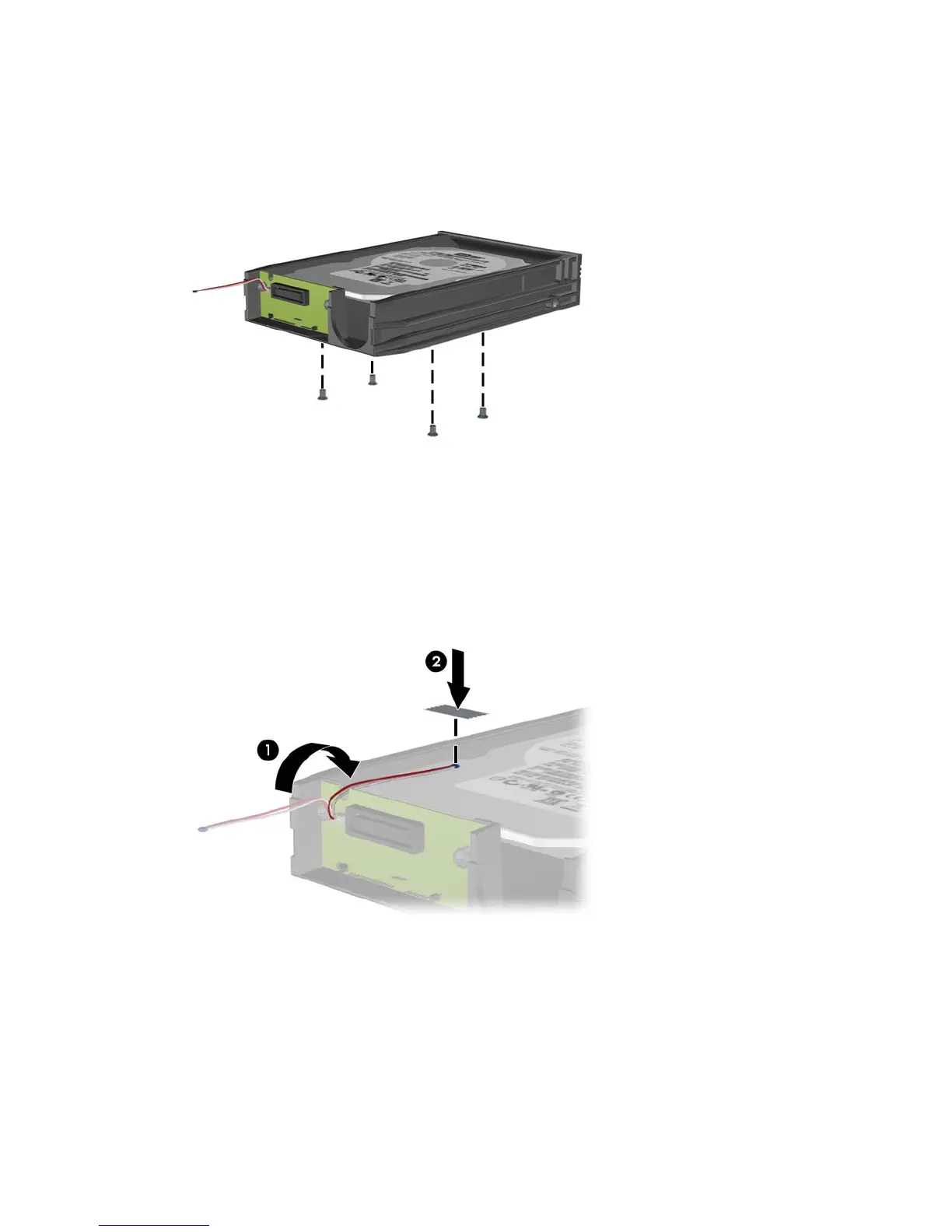 and attach the thermal sensor to the top of the hard drive with the adhesive strip (2).