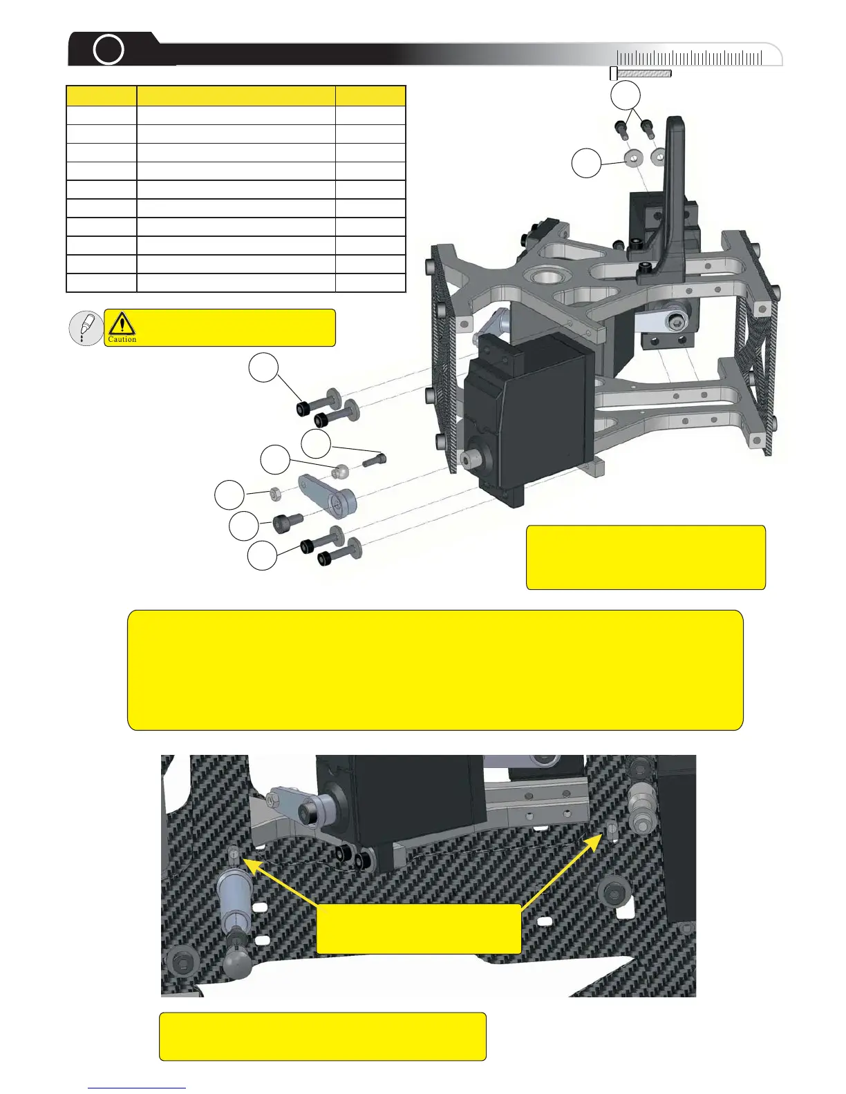 with medium threadlock. Fix the servos at the upper bearing block. Install the main shaft through all