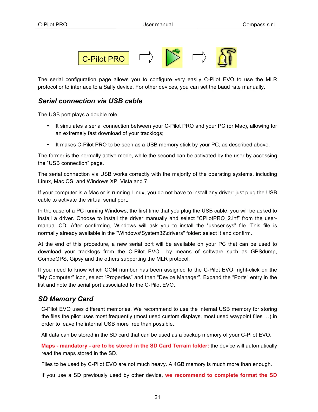 All data can be stored in the SD card that can be used as a backup memory of your C-Pilot EVO.