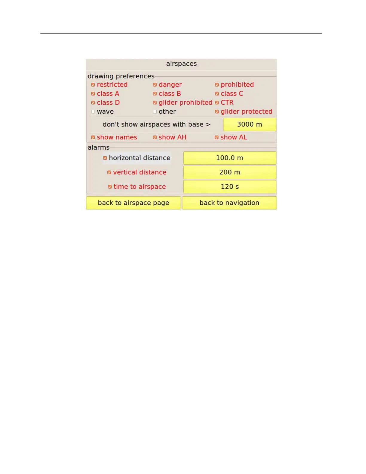 This page allows choosing the airspaces to be shown on the map based on their class. To avoid