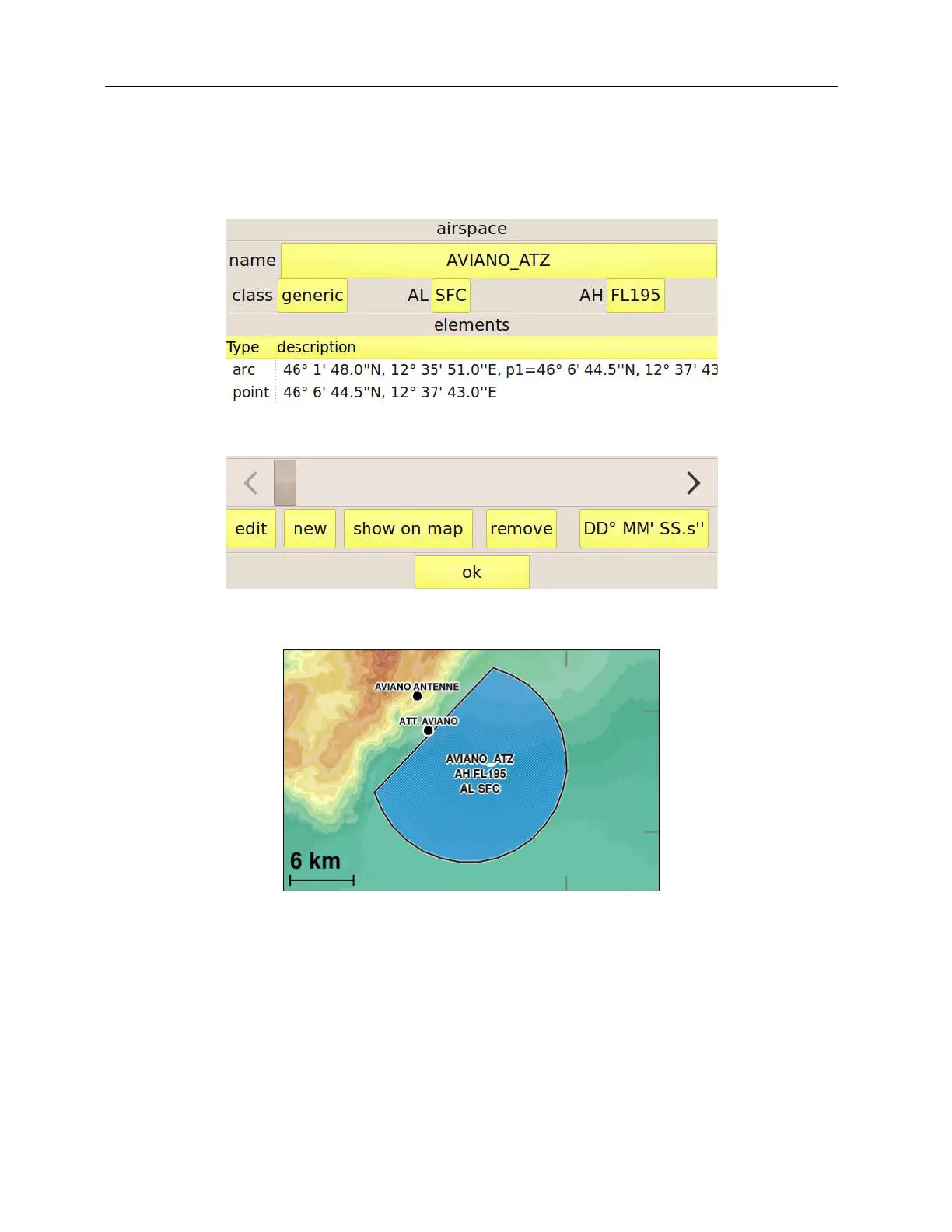 editing. The list shows the elements that compose the airspace. The “edit” and “remove” buttons