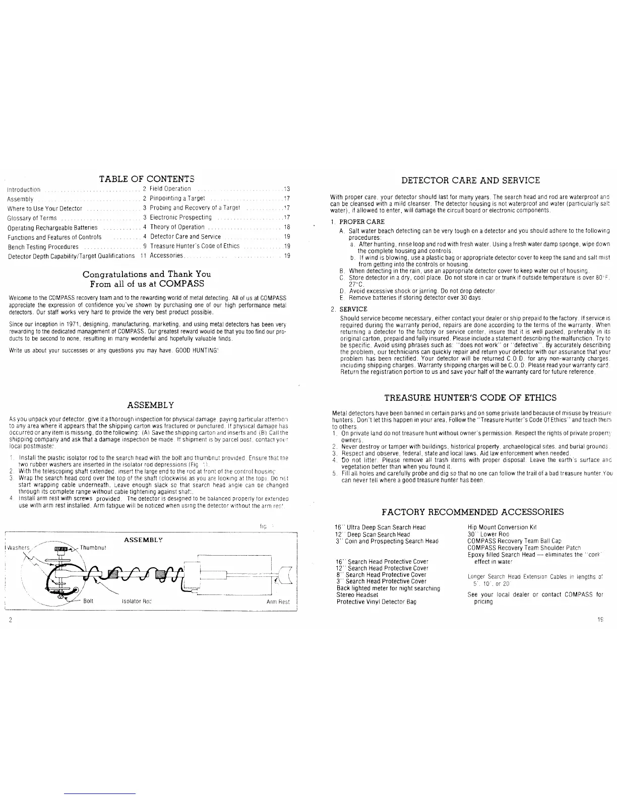 Compass Challenger X-100 - DETECTOR CARE AND SERVICE; 1. PROPER CARE; 2. SERVICE; TREASURE HUNTERS CODE OF ETHICS