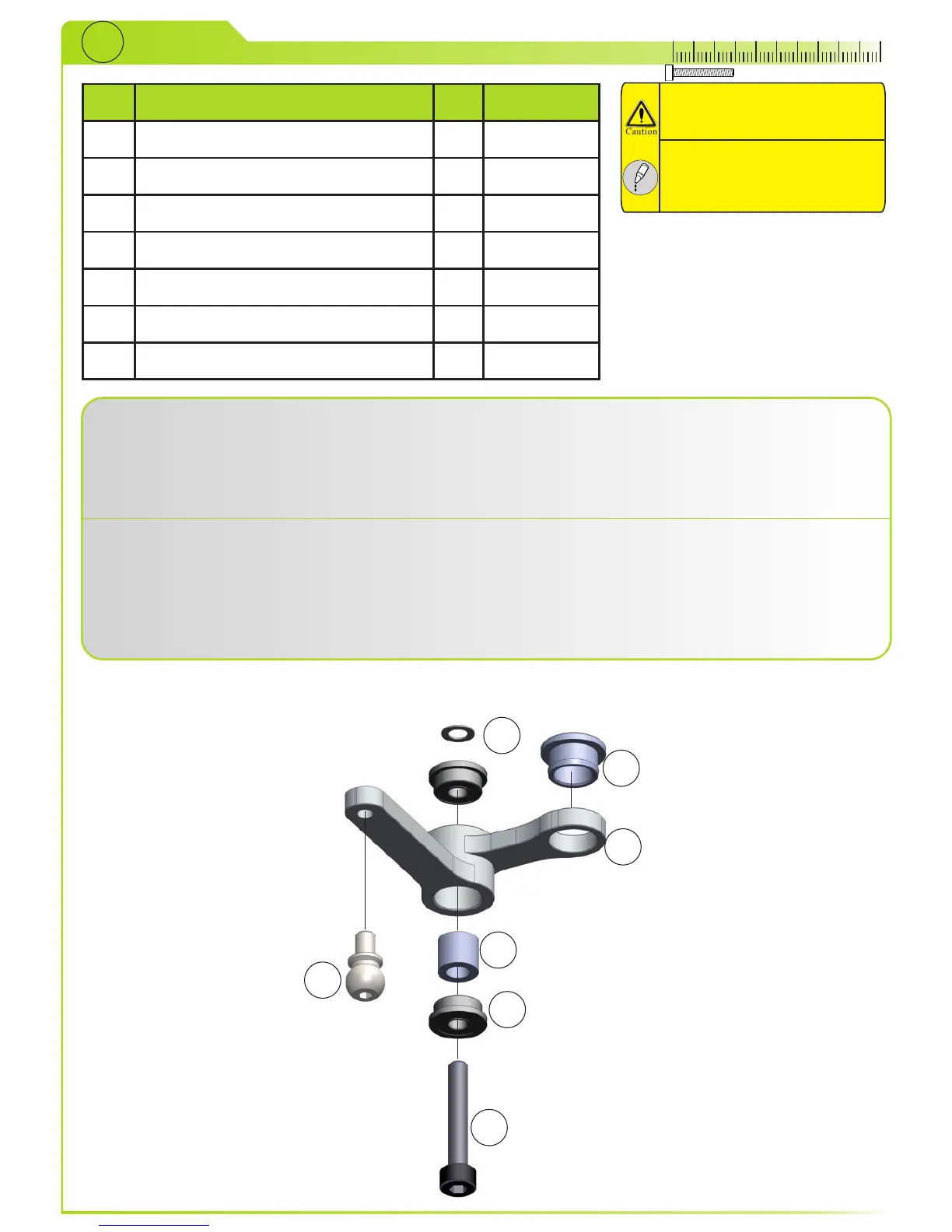 bearings (6) with Spacer (2) between them into tail control Arm. Mount ball (5) to flat side of tail control arm. Push bolt (1)