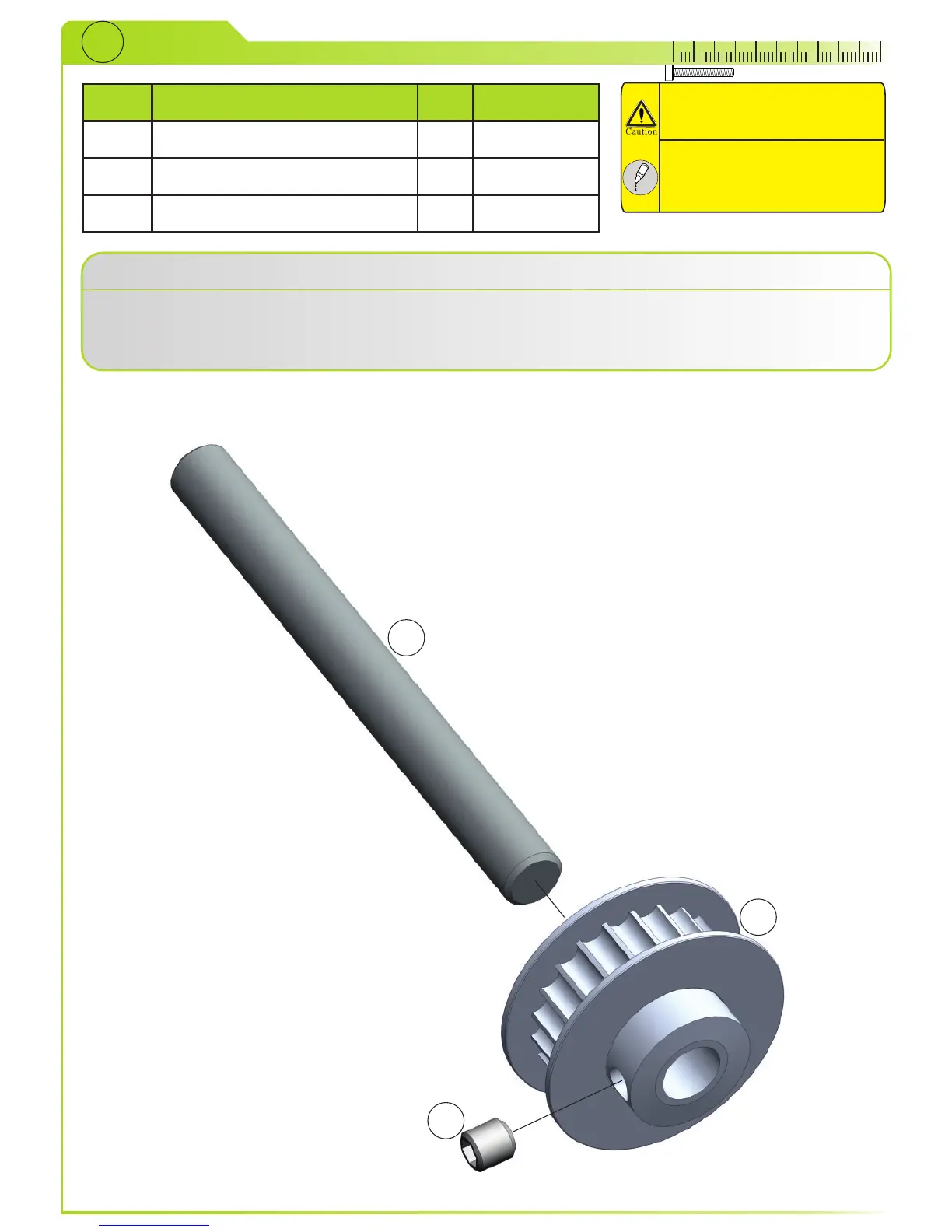 Slide tail shaft (1) trough tail pulley (2) and secure it with set screw (3).
