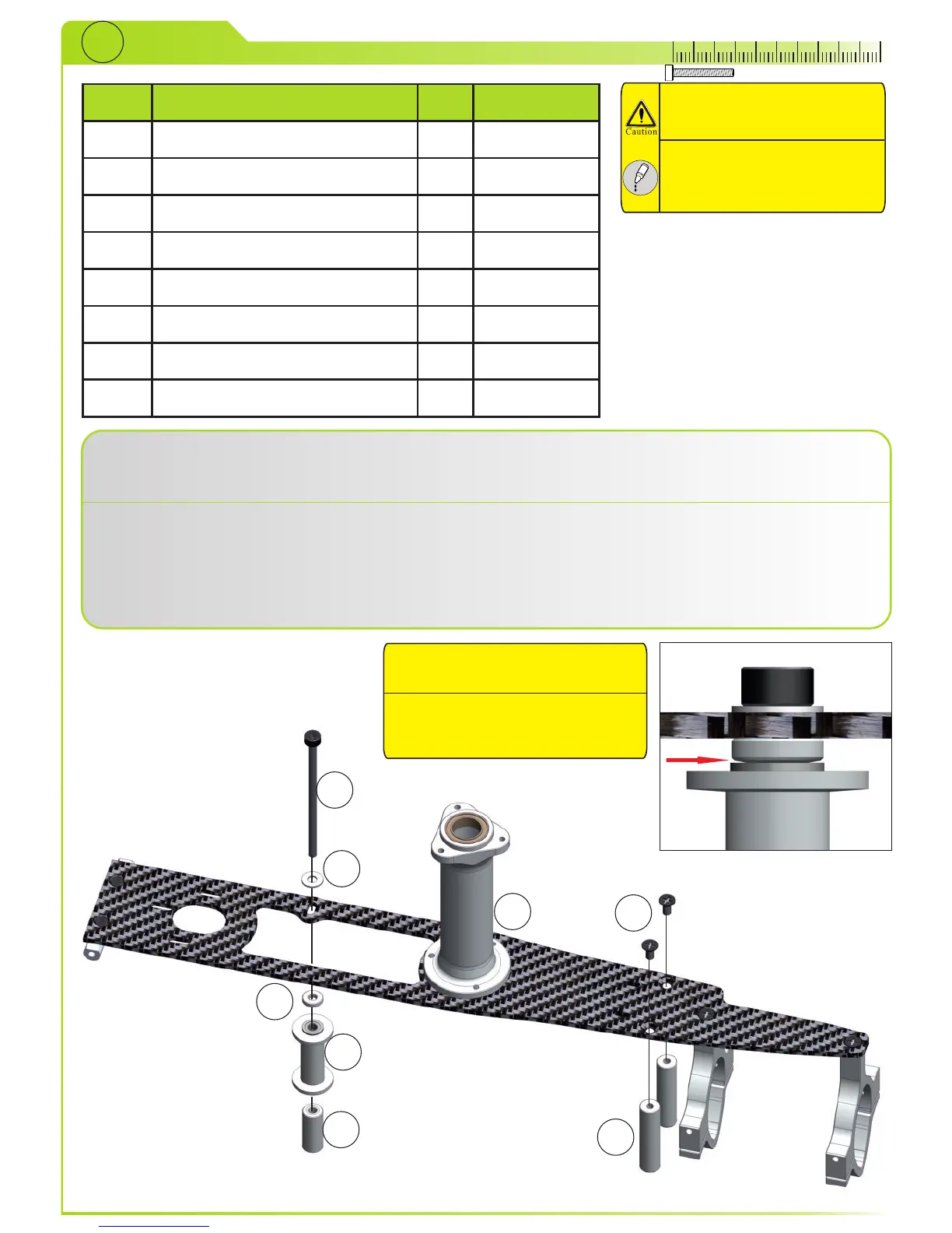 Schieben Sie die Schraube (6) durch die Scheibe (7), CFK Platte (1), den oberen Abstandshalter (3), die