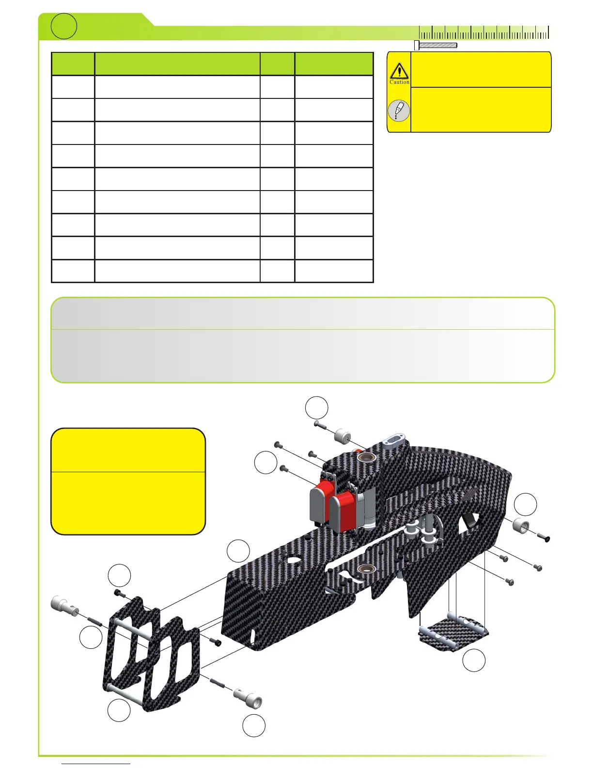 Mount ESC tray (2), FBL tray (3) and canopy mounts (4,5) with bolts (6,7,8) and set screw (9) to