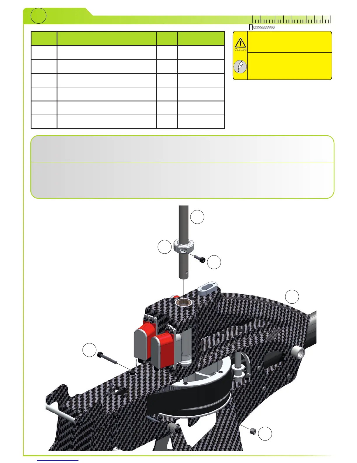 Schieben Sie die Hauptrotorwelle (2) durch die Lagerböcke im Frame (1) und ziehen Sie die