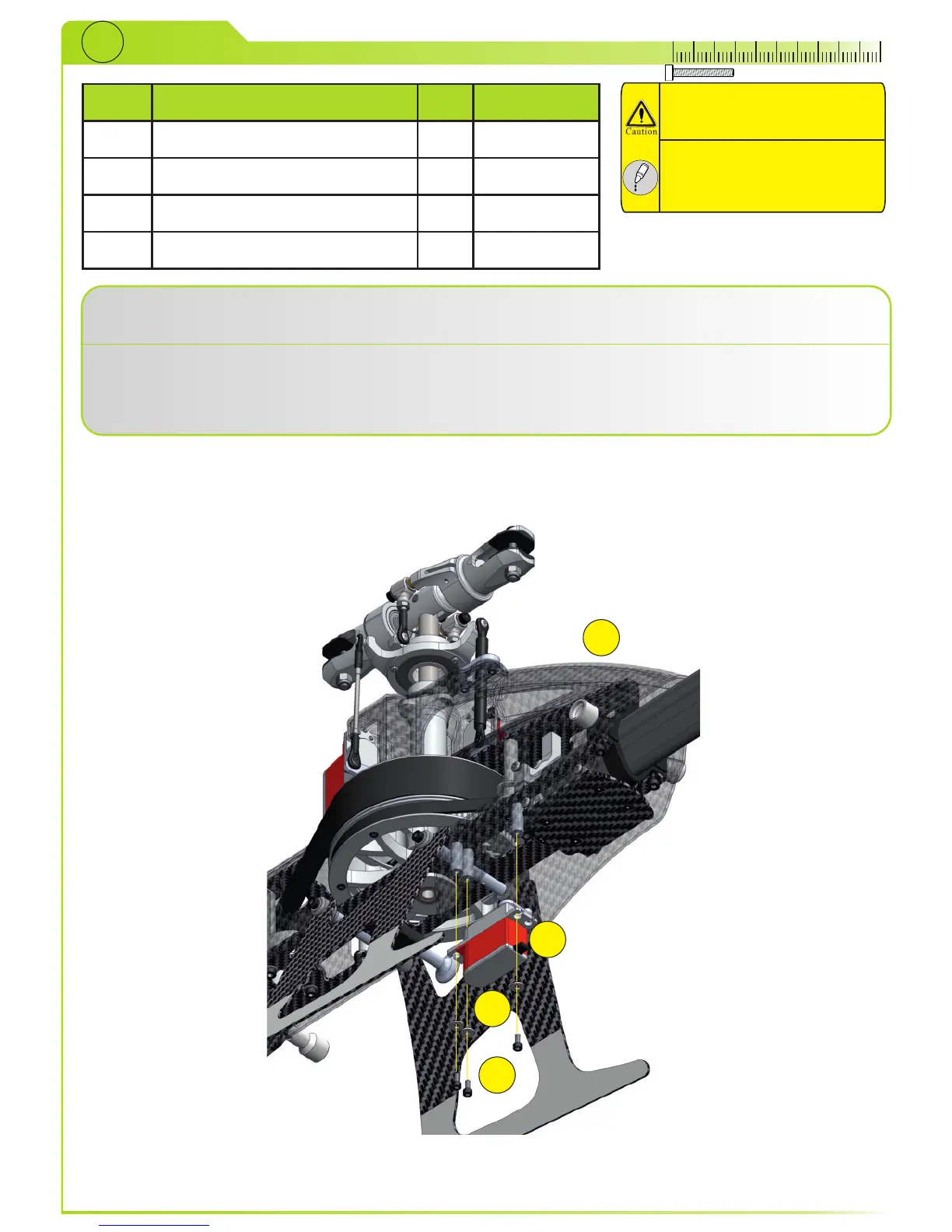 Slide bolts (3) through washers (4) and mount tail servo (2) to frame (1). Clip tail