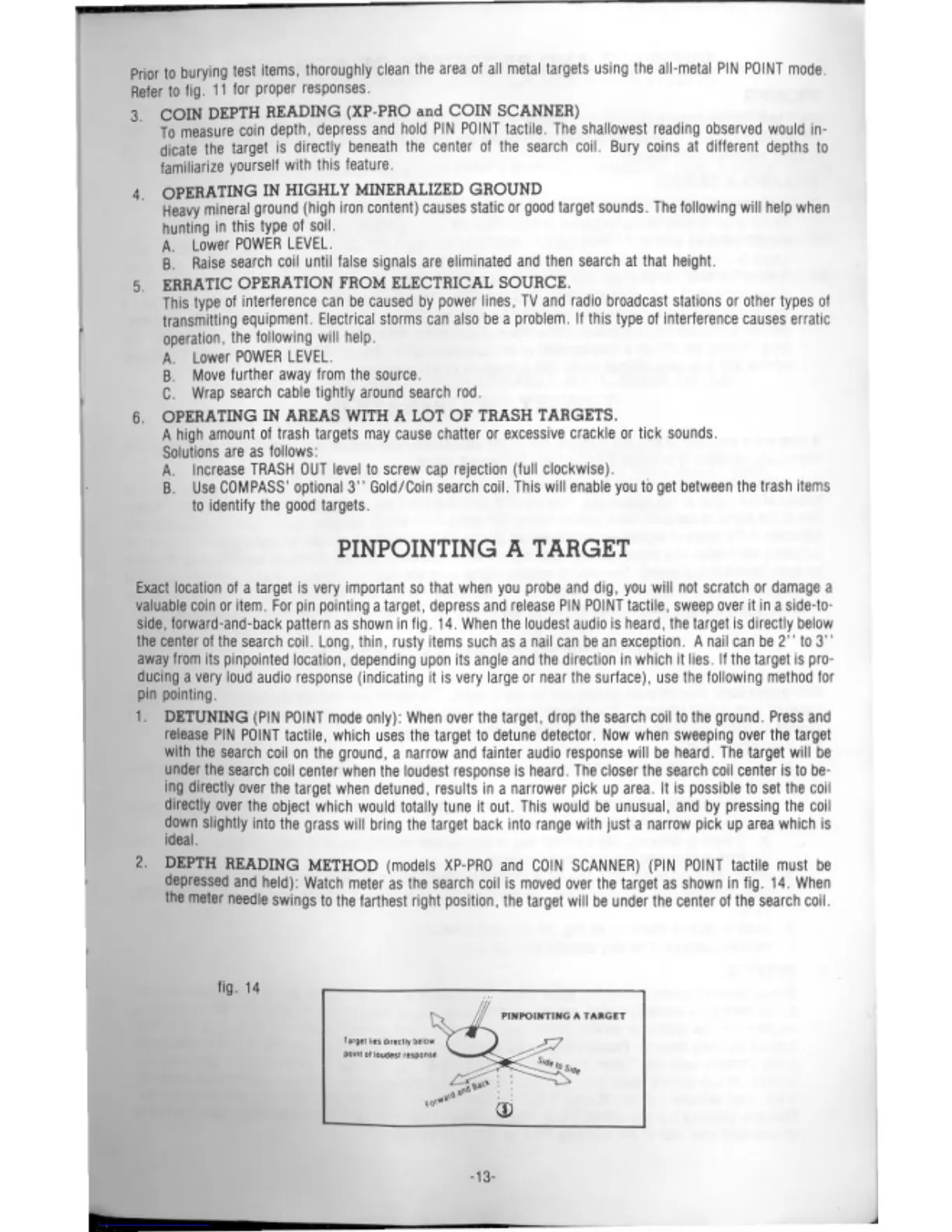 Compass XP-350 - Pinpointing a Target; Coin Depth Reading; Operating in Highly Mineralized Ground; Erratic Operation from Electrical Source