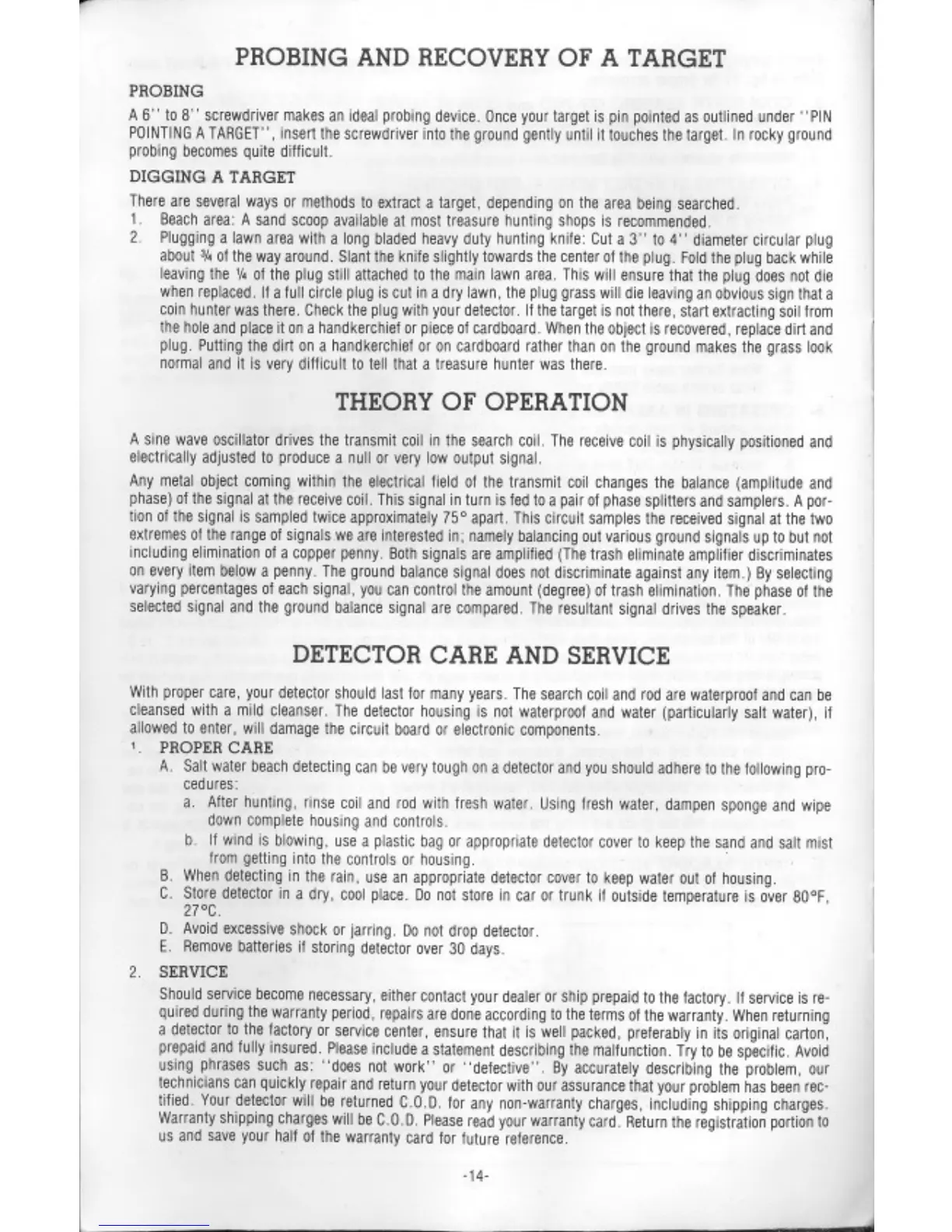 Compass XP-350 - Probing; Digging a Target; Detector Care and Service; Proper Care