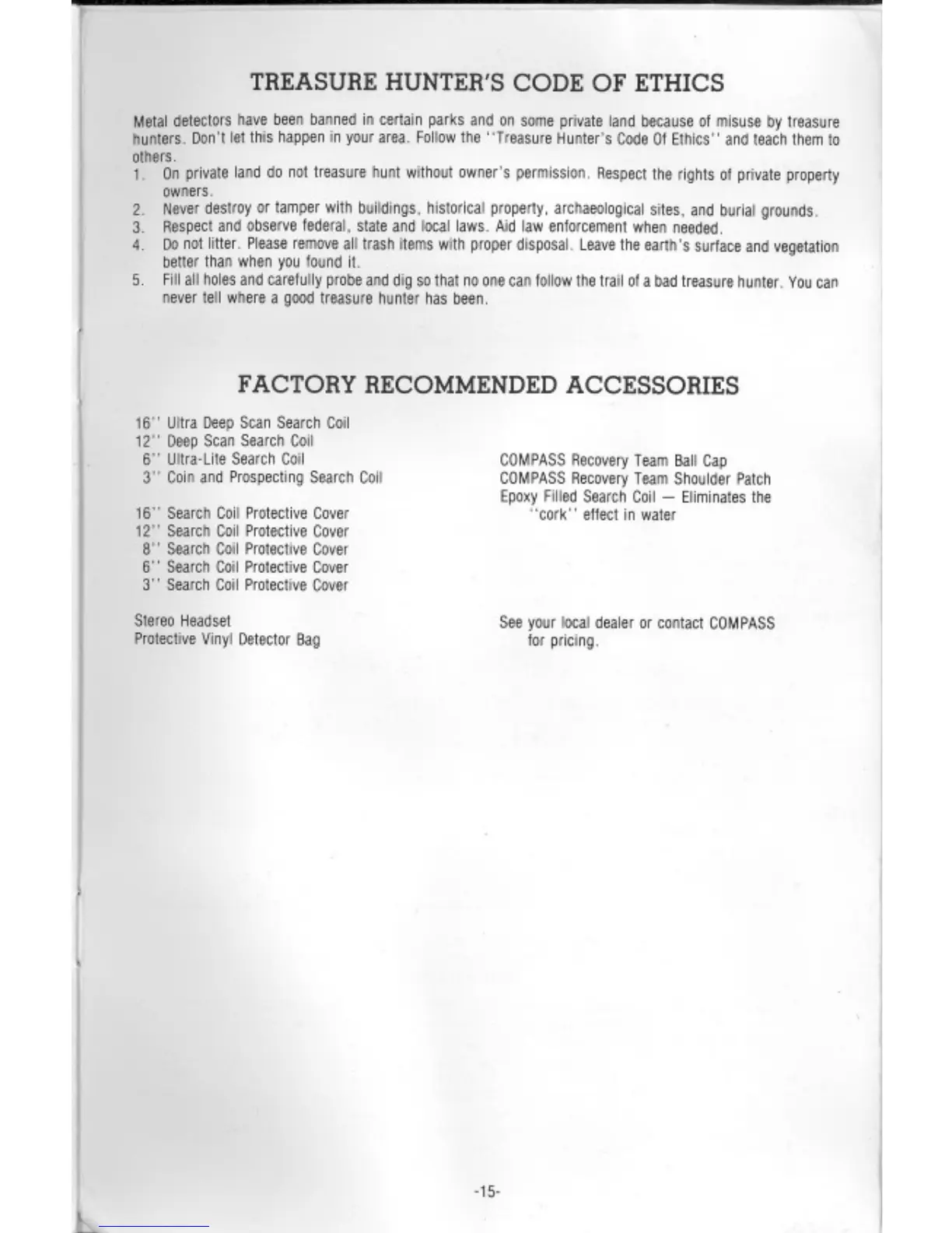 Compass XP-350 - Treasure Hunters Code of Ethics; Factory Recommended Accessories