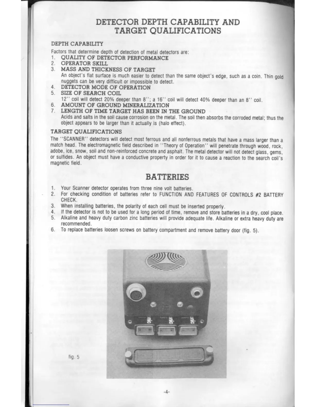 Compass XP-350 - Detector Depth Capability and Target Qualifications; Batteries