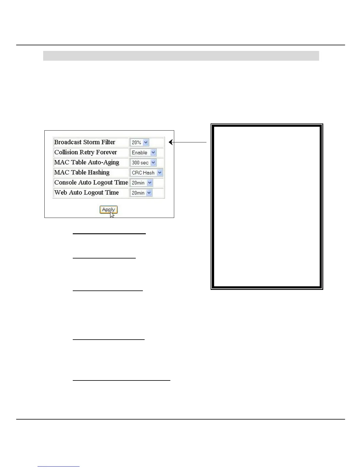 IP configuration, restore the setting to factory default and configuring auto aging, etc.