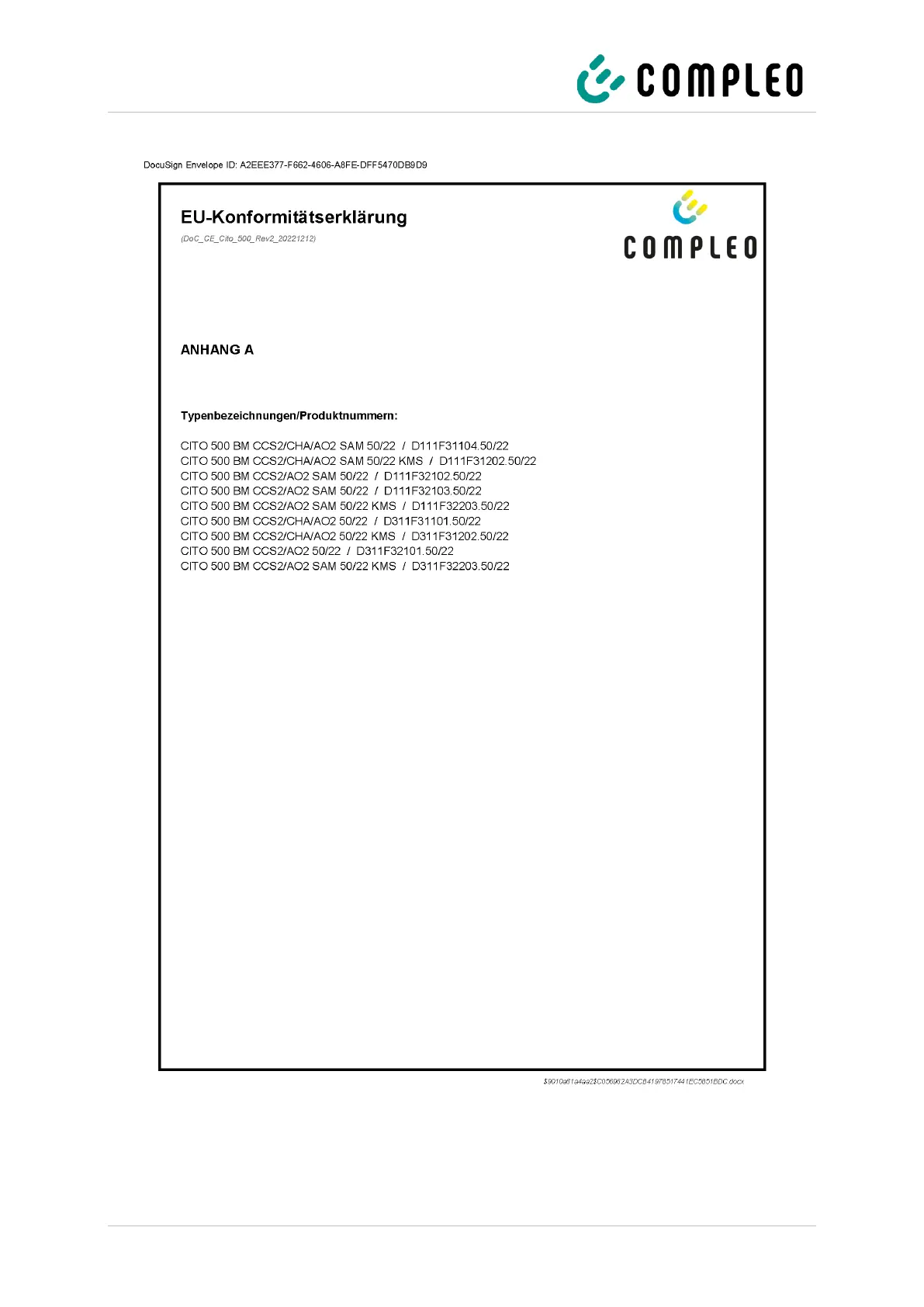 Declaration of conformity of the compleo® Cito BM 500 charging system incl. compleo® SAM