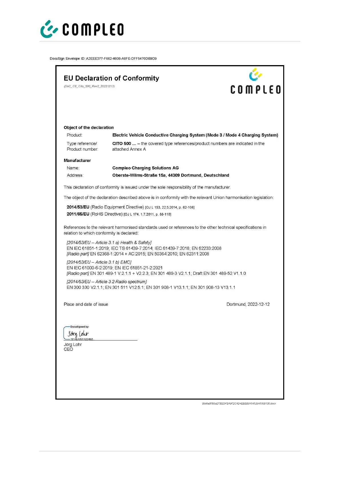 Declaration of conformity of the compleo® Cito BM 500 charging system incl. compleo® SAM