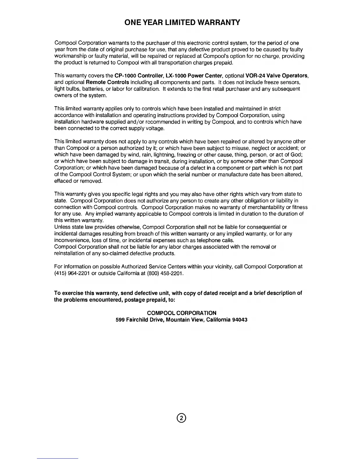 Compool Corporation warrants to the purchaser of this electronic control system, for the period of one