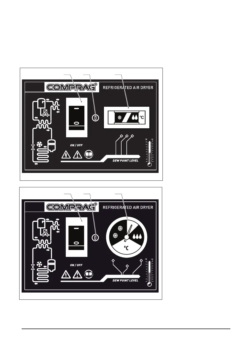 The control panel of the dryer comprises a main switch, start and stop buttons, dew-point