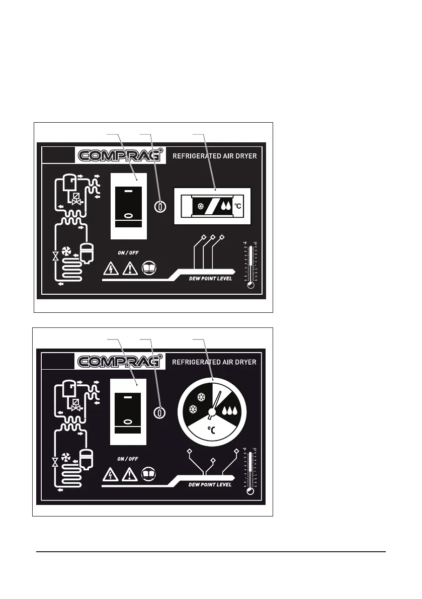 Das Bedienfeld des Kältetrockners enthält einen Hauptschalter, einen Ein- und Aus-Schal-