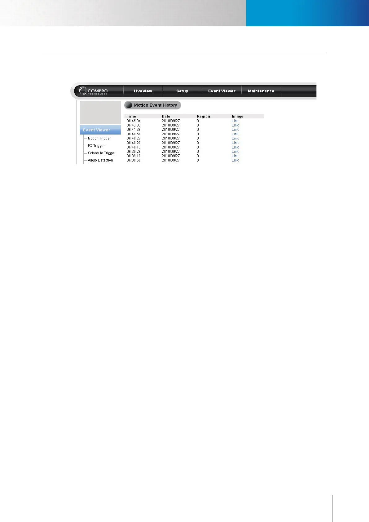 Here displays the history of past events successfully triggered by motion, I/O, schedule or audio detection.