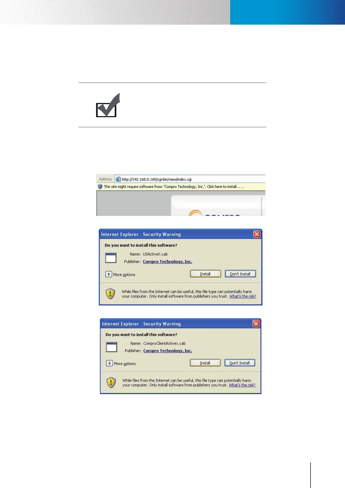 Once you launch the Internet Explorer and enter the camera’s IP address in the address eld, you'll be asked