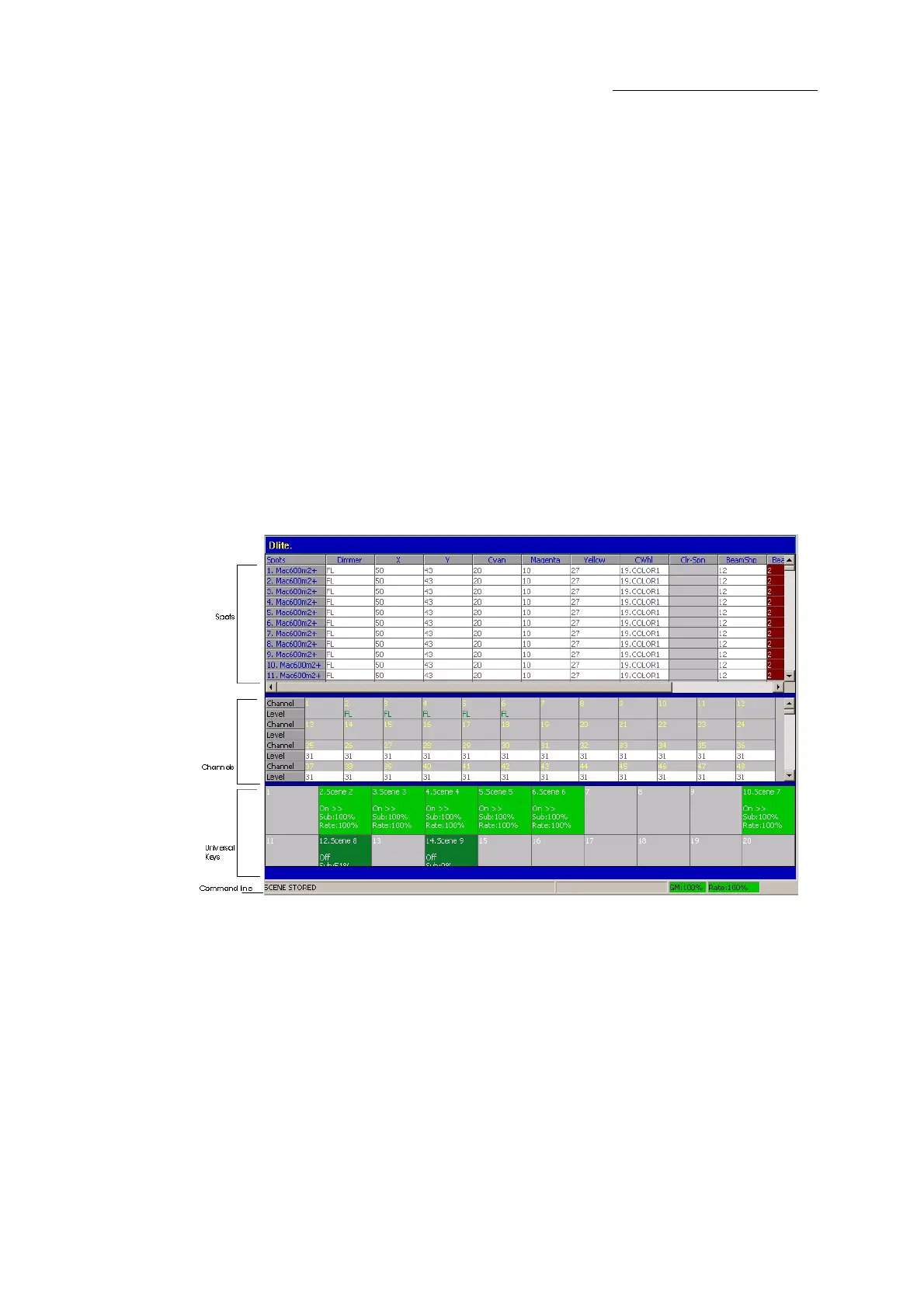 Live fixtures (spot or channel or extra) display - shows fixtures and their parameter levels.