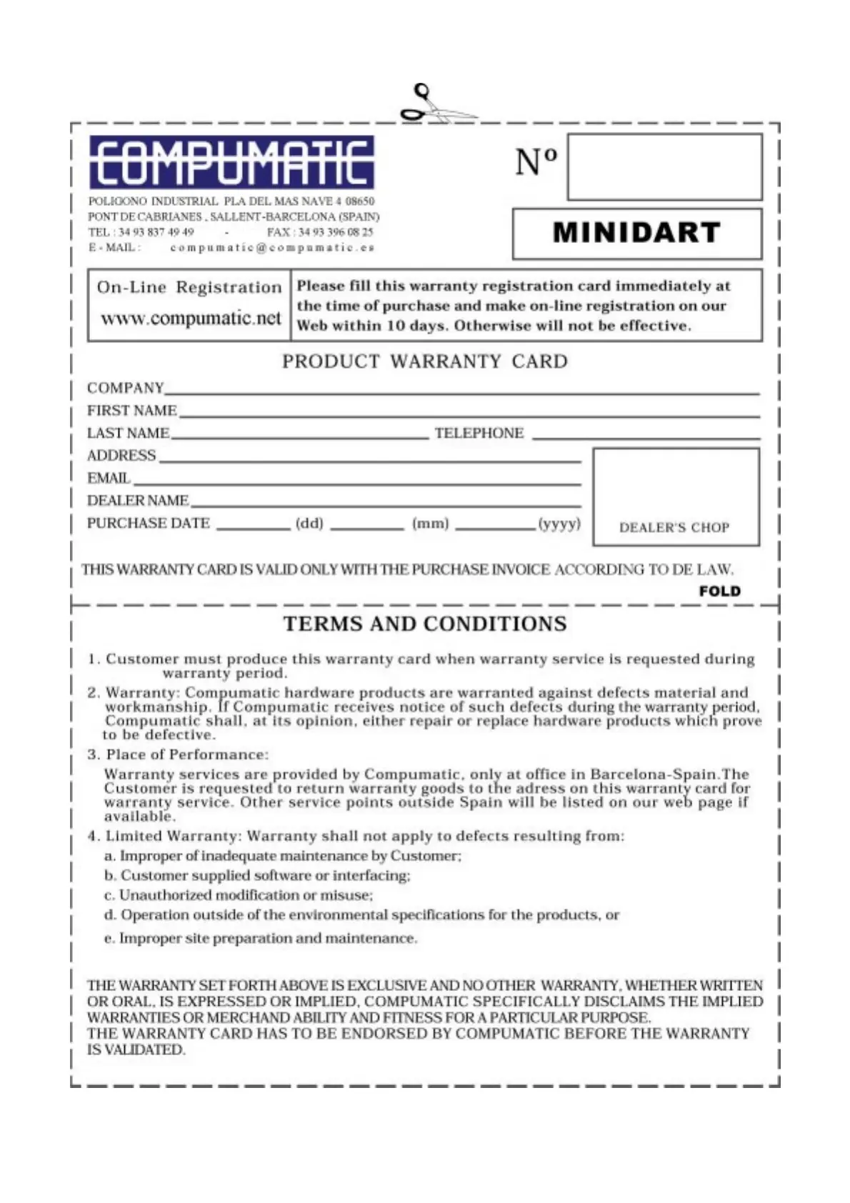 Compumatic MINIDART v3 - Product Warranty Card; Terms and Conditions
