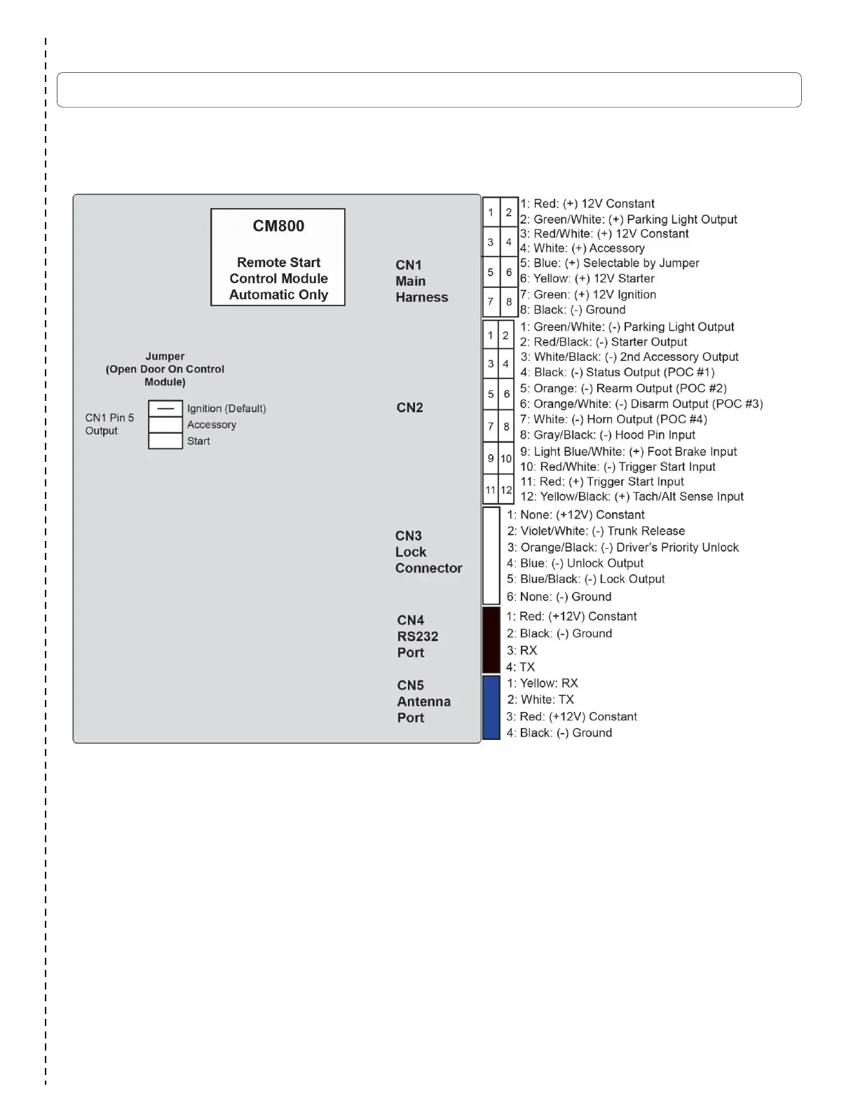 CompuSTAR Firstech CM800-S - CM800-S Wiring Schematic; CN1 Main Harness Pinouts; CN2 12-Pin Harness Pinouts; CN3 Lock Connector Pinouts