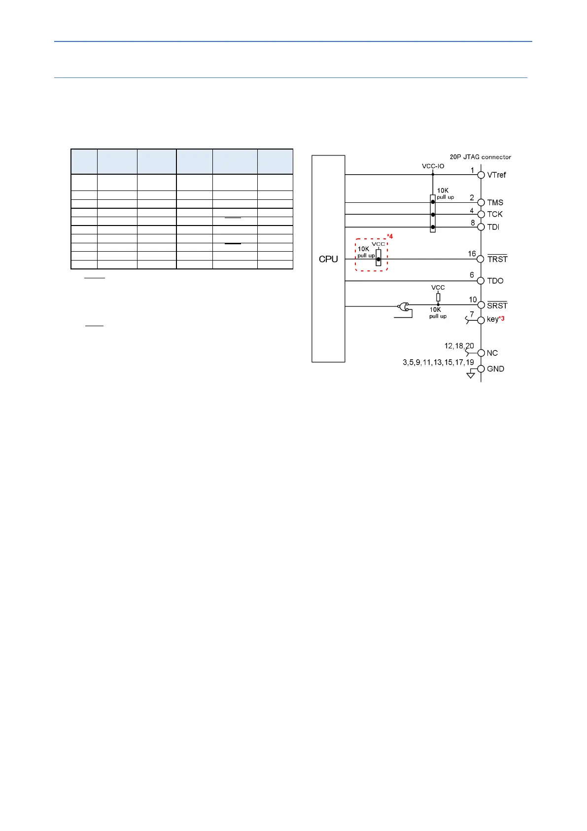 The signal table and target connection reference diagram when connecting a 20-pin 1.27mm pitch connector with JTAG