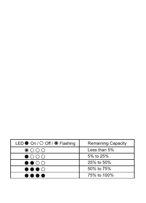 • Press On/Off button and LEDs will show remaining capacity