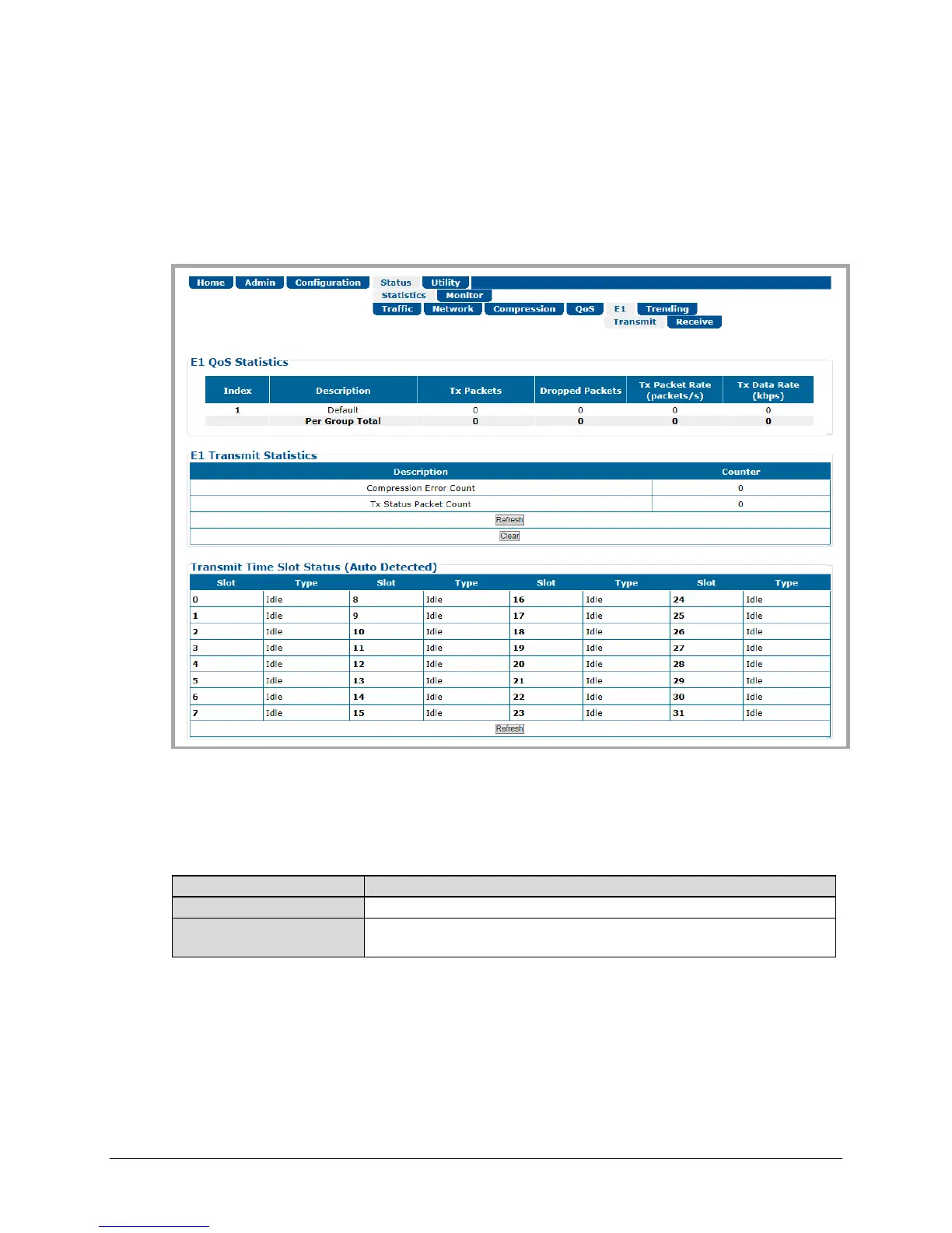 Click [Clear] to clear all E1 Transmit Statistics from the buffer.