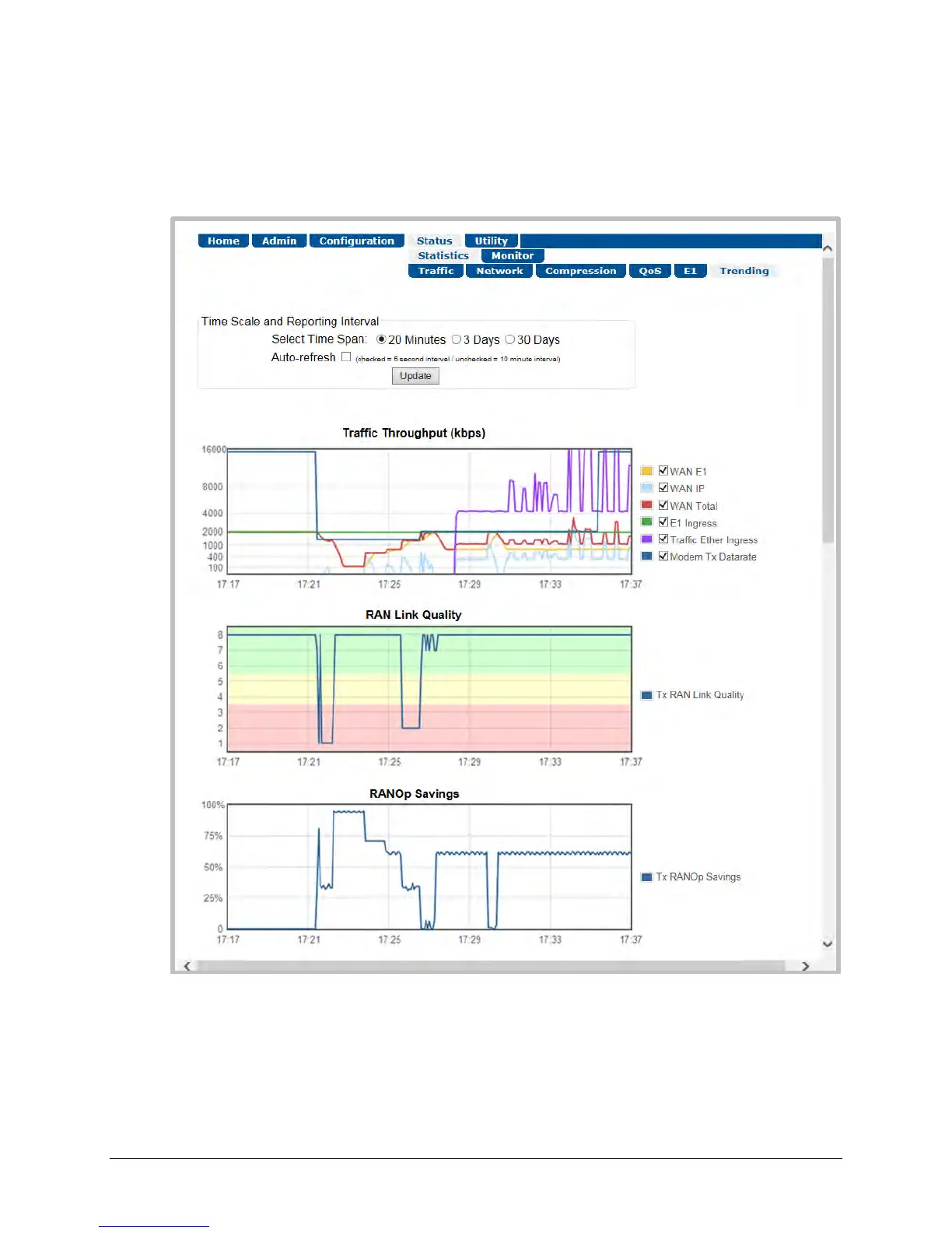 To initialize the page: Select the Time Span for the graphs as 20 minutes, 3 Days, or 30 Days.