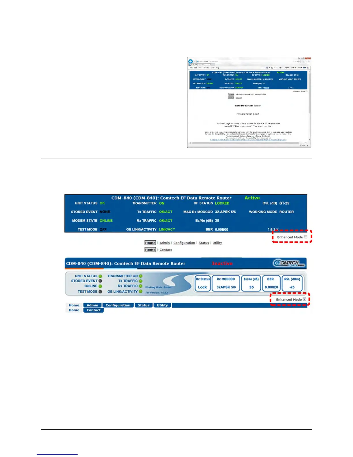 format. The Enhanced Mode features virtual LEDs and navigation tabs for web page access.
