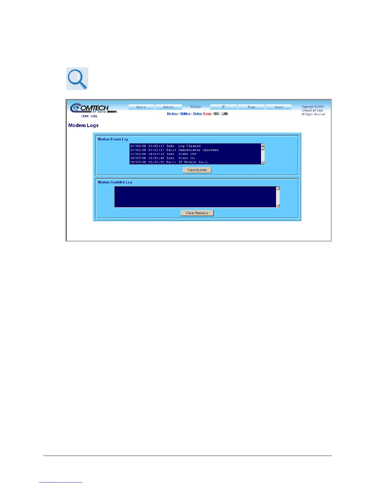 Click [Clear Events] to delete all existing log entries from the Modem Events Log. The log is