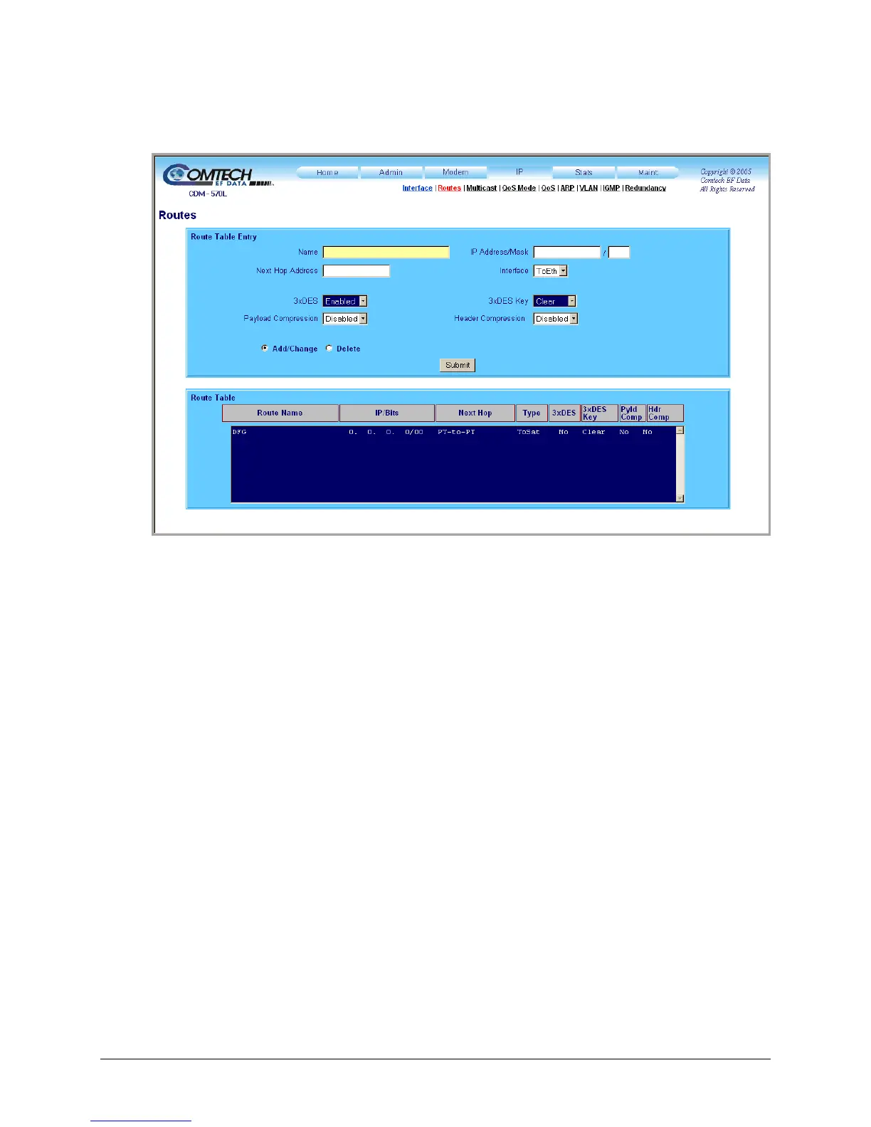 Use this page to enter static routes into the IP Module for routing IP traffic over the satellite or to
