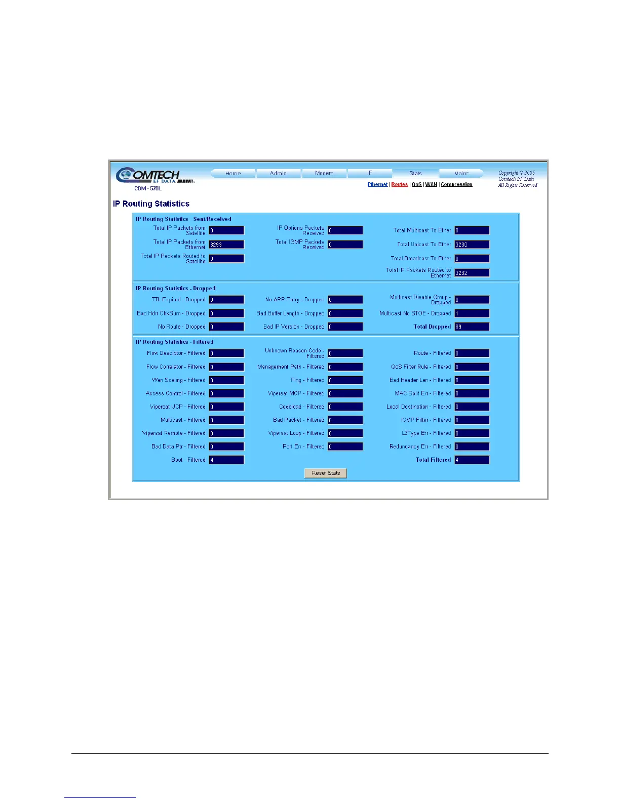 Sent/Received, Dropped, and Filtered basis. Click [Reset Stats] to view the most recent IP