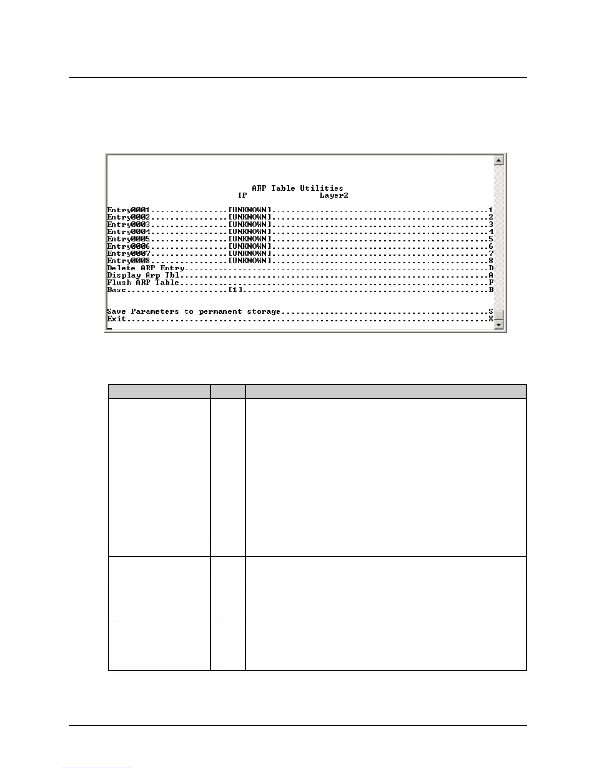 Delete ARP Entry D Deletes a Static ARP entry. Queries the user for the IP address of the ARP