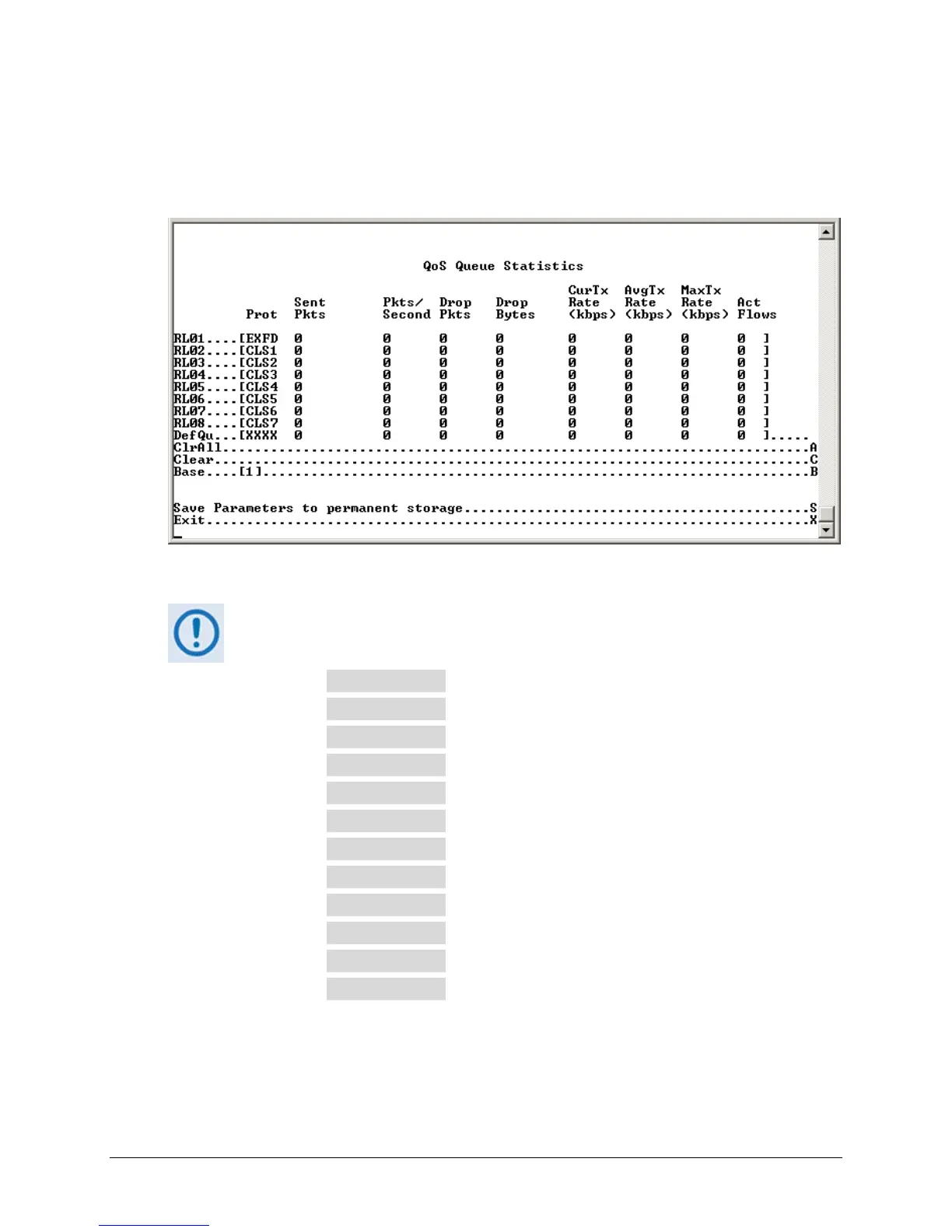 Activate the QoS Statistics page from the Statistics Menu page. This page displays the statistics